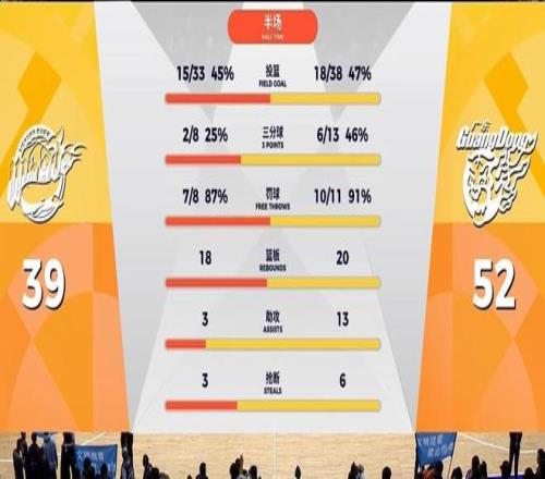 后半節有了奎因,廣東攻防兩端回歸正常,奎因接連制造搶斷連得6分,帶領廣東再打出一波4分鐘11-4,半場領先來到52-39,奎因半場17中6砍下16分5板2助5搶斷(別看投籃鐵,但正負值+20),薩林杰7中5得到13分6板5助,胡隊命中3記三分得到11分(焦泊喬王少杰表現最差)。